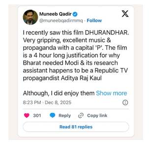 His sentiments were shared by several online voices. Writer Muneeb Qadir described the film on X (formerly Twitter) as “very gripping, excellent music — and propaganda with a capital ‘P’.”