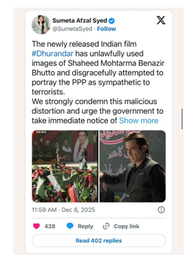 The Pakistan Peoples Party (PPP), however, has strongly condemned the film. Sumeta Afzal Syed, spokesperson for the PPP and a member of the Sindh Task Force, issued a firm statement denouncing the movie’s portrayal of the party. She said, “The newly released Indian film Dhurandhar has unlawfully used images of Shaheed Mohtarma Benazir Bhutto and disgracefully attempted to portray the PPP as sympathetic to terrorists.”