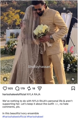 Meanwhile, another topic that caught attention was Nyla Raja’s wedding outfit. For her big day, she chose to wear a bridal dress designed by Haris Shakeel. The designer later shared her wedding shoot but added a clear statement in his caption, saying that they have nothing to do with Nyla Raja’s personal life and are not supporting her. He emphasized that the post should be viewed only from a fashion perspective and kept strictly about the outfit.