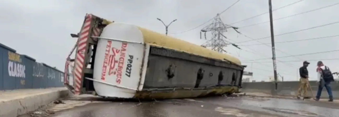 کراچی،لانڈھی میں 50 ہزار لیٹر ڈیزل سے بھرا ٹینکر الٹ گیا،پولیس نے جائے وقوعہ کو گھیرلیا
