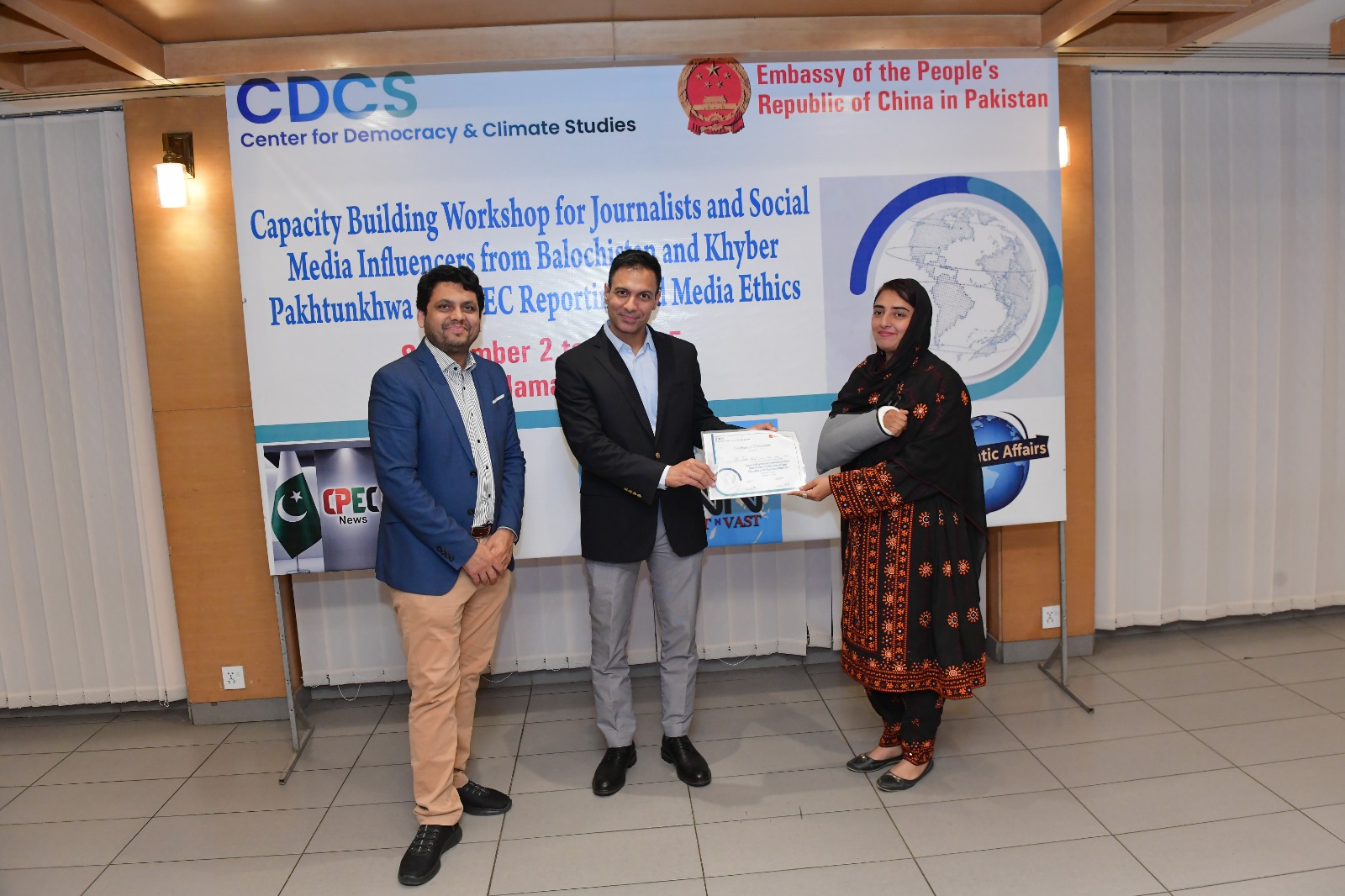 انہوں نے کہا: “امید ہے کہ صحافی اور آن لائن انفلوئنسرز اپنے پلیٹ فارمز کو پیشہ ورانہ اور ذمہ دارانہ انداز میں استعمال کریں گے، چین سے متعلق خبروں کے ترجمان، چین کے بارے میں تصورات کے مفسر اور چین کے ساتھ دوستانہ عوامی رائے کے رہنما کے طور پر کام کریں گے، اور یوں دونوں ممالک کے درمیان روایتی دوستی اور عوامی سطح پر قربت کو فروغ دینے میں اپنا حصہ ڈالتے رہیں گے۔” تربیتی ورکشاپ کے شرکاء نے پروگرام کو سراہتے ہوئے اعتراف کیا کہ اس طرح کے اقدامات پیشہ ورانہ صلاحیتوں کو بہتر بناتے ہیں اور پاک۔چین تعلقات کے بارے میں درست بیانیہ کو فروغ دیتے ہیں۔ سی ڈی سی ایس کے ایگزیکٹو ڈائریکٹر ڈاکٹر فرقان راؤ نے کہا کہ پاکستان اور چین سدا بہار اسٹریٹجک پارٹنرز ہیں اور ایک مثالی دوستی سے لطف اندوز ہو رہے ہیں۔ انہوں نے کہا کہ میڈیا کو چاہیے کہ وہ دوطرفہ تعلقات کو مزید مضبوط بنانے میں تعمیری کردار ادا کرے۔ حقائق پر مبنی رپورٹنگ پاکستانی عوام کو سی پیک کے منصوبوں کے بارے میں درست معلومات فراہم کر سکتی ہے۔ اختتامی تقریب کے موقع پر چیف گیسٹ پاکستان۔