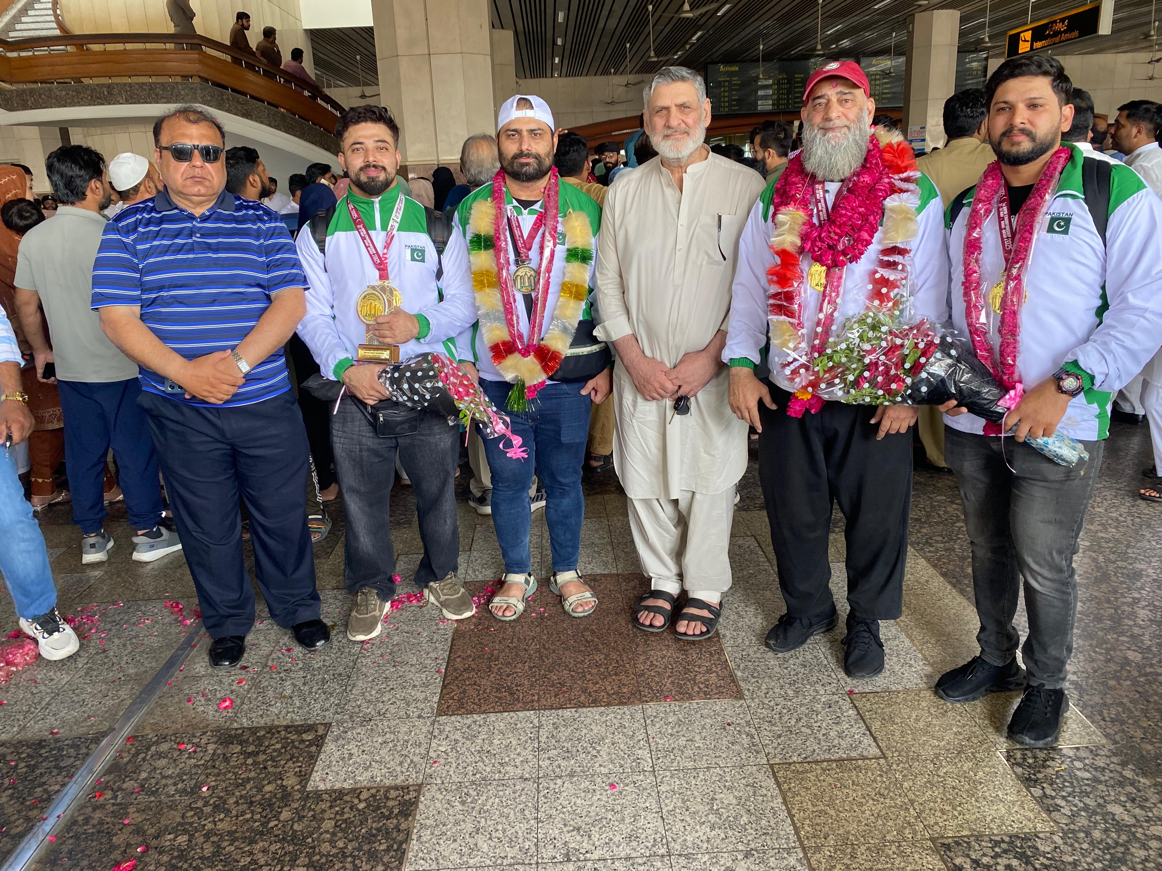 قومی ویٹ لفٹرز ایشین ماسٹرز ویٹ لفٹنگ چیمپئن شپ سے 3 گولڈ ایک براونز میڈلز جیت کر وطن واپس پہنچ گئے ۔لاھور ایر پورٹ پر حافظ عمران بٹ اور،عقیل جاوید بٹ اور ویٹ لفٹنگ شایقین اور کھلاڑیوں نے ٹیم کا پرجوش استقبال کیا ۔ پاکستانی ویٹ لفٹرز نے دوحہ، قطر میں تاریخ رقم کر دی: مقصود امجد راٹھور گولڈ . عمر رسول لون گولڈ .فرقان انور (Best Lifter) گولڈ اور عثمان راٹھور براونز میڈل حاصل کئے۔ یہ صرف تمغے نہیں... یہ پوری قوم کا فخر ہیں! پاکستانی ویٹ لفٹرز کی ایشین ماسٹرز چیمپئن شپ 2025 میں تاریخی کامیابی۔الحمدللہ! پاکستان ویٹ لفٹنگ فیڈریشن کے کھلاڑیوں نے دوحہ، قطر میں منعقدہ پہلی ایشین ماسٹرز ویٹ لفٹنگ چیمپئن شپ 2025 میں شاندار کارکردگی کا مظاہرہ کرتے ہوئے تین طلائی (گولڈ) اور ایک کانسی (برانز) کا تمغہ جیت کر ملک و ملت کا نام روشن کر دیا ۔ اس موقع پر فرقان انور کو ان کی شاندار کارکردگی کی بنیاد پر چیمپئن شپ کا بہترین کھلاڑی (Best Lifter) بھی قرار دیا گیا، جو پاکستان کے لیے ایک اعزاز ہے۔ علاوہ ازیں، فرقان انور کا ڈوپ ٹیسٹ واڈا (WADA) کی نگرانی میں لیا گیا ہے۔ ان شاءاللہ، اس کا نتیجہ منفی آنے کی پوری توقع ہے، کیونکہ پاکستان ویٹ لفٹنگ فیڈریشن ڈوپنگ قوانین کی سختی سے پاسداری کرتی ہے اور واڈا کے ساتھ مکمل تعاون جاری رکھے ہوئے ہے۔ یہ فیڈریشن کی شفافیت اور کلین اسپورٹس کے عزم کا مظہر ہے۔ پاکستان بھر کے عوام کو اس عظیم کامیابی پر دل کی گہرائیوں سے مبارکباد پیش کی جاتی ہے۔