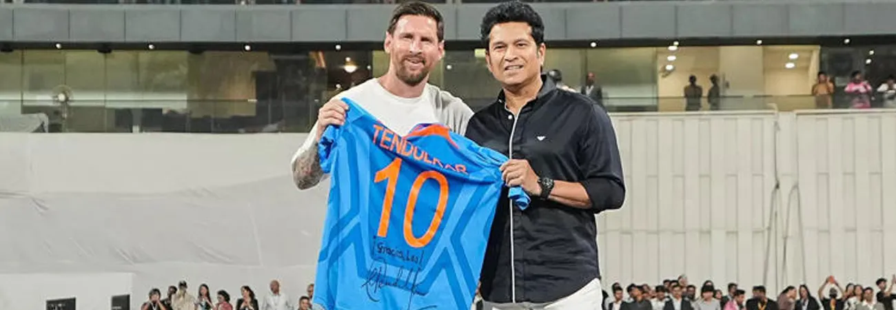 بھارتی ماسٹر بیٹرسچن ٹنڈولکر اور لیونل میسی کی ممبئی کے وانکھیڈے اسٹیڈیم میں ملاقات ہوئی، بھارتی کرکٹر نے لیجنڈ فٹبالر کو اپنی جرسی پیش کی۔ممبئی کے مشہور کرکٹ اسٹیڈیم میں ارجنٹائن کے عالمی شہرت یافتہ فٹبالر لیونل میسی نے بھارتی کرکٹ لیجنڈ سچن ٹنڈولکر سے ملاقات کی اور ایک دوسرے کے لئے نیک خواہشات کا اظہار کیا، سچن نے میسی کو اپنی کرکٹ جرسی دی جبکہ بدلے میں میسی نے سچن کو ورلڈ کپ فٹبال تحفے میں دی۔ممبئی کے وانکھیڈے اسٹیڈیم میں ہونے والی تقریب کے دوران سچن ٹنڈولکر نے کہا کہ میں نے یہاں کچھ ناقابل یقین لمحات گزارے جیسا کہ ہم ممبئی کو خوابوں کا شہر کہتے ہیں، ہم نے 2011 میں اسی گرانڈ پر سنہری لمحات دیکھے تھے۔ میسی کے بارے میں بھی گفتگو کرتے ہوئے سچن ٹنڈولکر نے کہا کہ جب لیونل میسی کی بات آتی ہے، اگر میں ان کے کھیل کے بارے میں بات کروں تو یہ صحیح پلیٹ فارم نہیں ہوگا۔ ٹنڈولکر نے کہا کہ سب جانتے ہیں کہ لوگ ان کے بارے میں کیا باتیں کرتے ہیں، میسی نے سب کچھ حاصل کر لیا ہے، ہم سب واقعی ان کی لگن، حوصلے اور عزم سے بہت متاثر ہیں۔