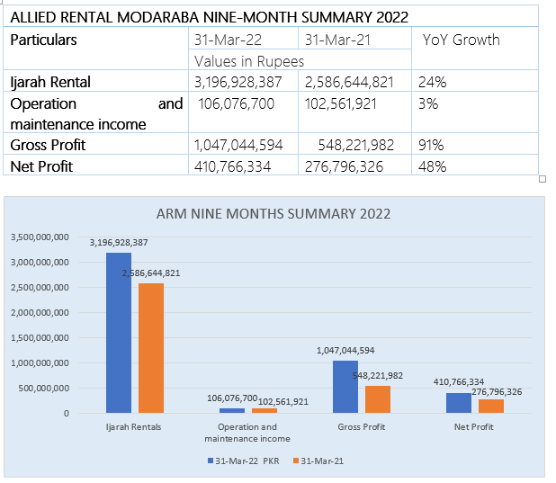 Allied Rental Modaraba’s Ijarah rental climbed 24% to PKR3.2 billion in the nine months ending March 31, 2022 compared with PKR 2.6 billion in the corresponding period of the previous year, reports WealthPK.