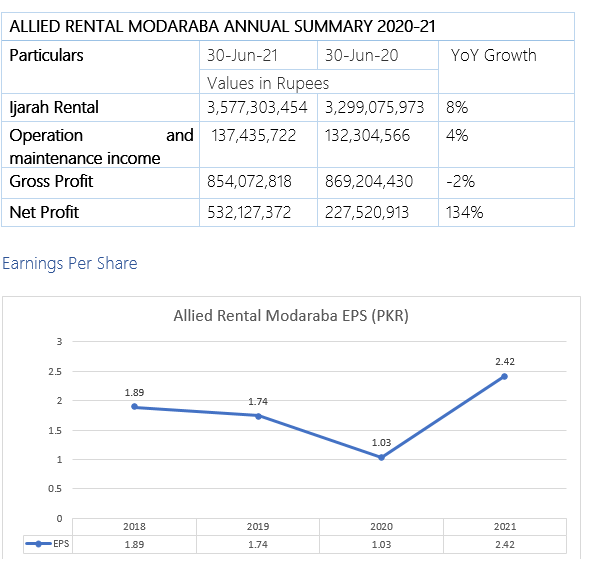During the Fiscal Year 2020-21, the Ijarah rental increased 8% to PKR3.6 billion as against PKR3.3 billion in 2019-2020. The gross profit for the year 2020-21 was PKR854 million, 2% down from PKR869 million the previous year. Profit after taxation for the year was PKR532 million with an increase of 134% compared to a profit of PKR227 million in the corresponding period of the previous year, reports WealthPK.