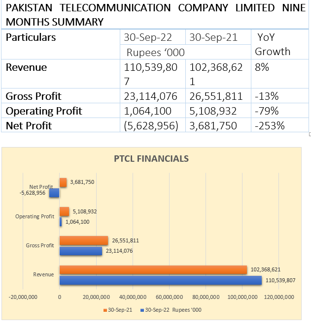 The devaluation of Pakistani rupee versus the US dollar, higher borrowing rates, and other expenses related to purchase of 4G spectrum and corresponding network rollout continued to put pressure on the PTCL’s profitability. The company suffered a net loss of Rs5.6 billion during the first nine months of 2022, reports WealthPK.
