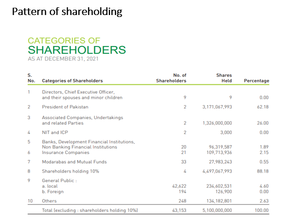 As of December 31, 2021, the President of Pakistan owned 62.18% of the company’s shares, followed by the associated companies holding 26%. Banks, development financial institutions, and non-banking financial institutions owned 1.89% of the shares, insurance companies 2.15%, general public (local) 4.60% and ‘others’ 2.63%, respectively.