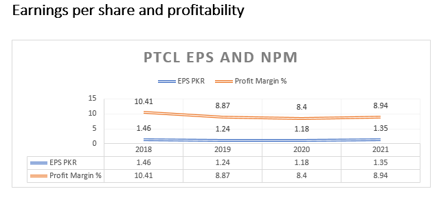 The company’s EPS decreased from 2018 to 2020. In 2021, the EPS broke the losing streak and increased to Rs1.35 from Rs1.18 in 2020. The net profit margin was 8.94% during 2021 after slightly increasing from 8.4% in 2020.