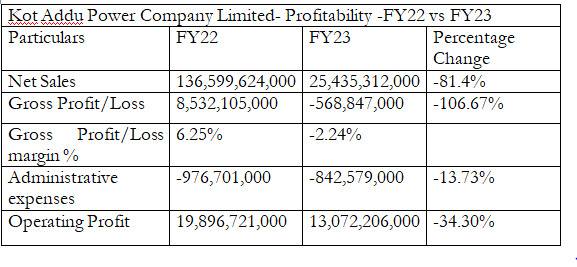 Kot Addu Power Company Limited (KAPCO) announced its financial results for the fiscal year ended June 30, 2023, posting a notable decline in net sales and profitability compared to FY22.According to the company’s results, it posted net sales of only Rs25.4 billion in FY23, which was 81.4% lower than Rs136.59 billion in FY22. The company limited its sales due to the Power Purchase Agreement (PPA) expiry on Oct 24, 2022. This resulted in a gross loss of Rs568.8 million in FY23 compared to a gross profit of Rs8.5 billion in FY22. The company attributed this loss to a rise in costs because of the addition of plant insurance and fixed expenses. The company also observed a hike in contributions to the Worker Participation Fund (WPF) and Workers Welfare Fund (WWF) and kept human resources despite the expiry of the PPA.
