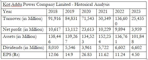 The company’s assets decreased from Rs138.4 billion in 2018 to the lowest of Rs101.8 billion in 2023. The highest assets of Rs152.2 billion were recorded in 2021. Similarly, the dividends fell overall from Rs8.01 billion in 2018 to Rs6.6 billion in 2023. KAPCO’s EPS varied over the period from Rs12.06 in 2018 to Rs4.50 in 2023. The highest EPS of Rs26.83 was recorded in 2020.