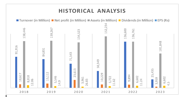 The company’s turnover decreased from Rs91.9 billion in 2018 to Rs50.3 billion in 2021. However, in 2022 the company achieved a remarkable turnover of Rs136.6 billion, which fell significantly to Rs25.4 billion in 2023.