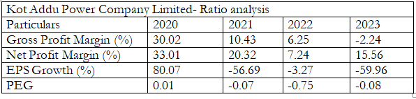 KAPCO observed a decreasing trend in gross profit margin from 2020 to 2023. The company recorded a gross profit margin of 30.02% in 2020, 10.43% in 2021 and 6.25% in 2022, but a gross loss margin of 2.24% in 2023. The net profit margin followed a fluctuating trend as it decreased from 33.01% in 2020 to 7.24% in 2022, but increased to 15.56% in 2023.