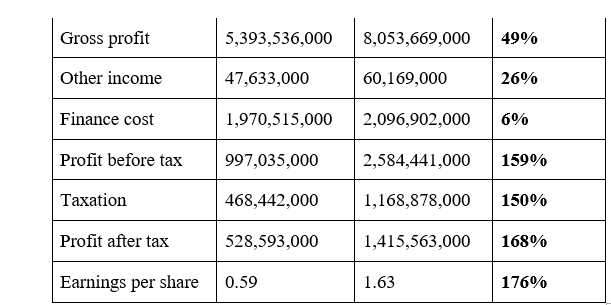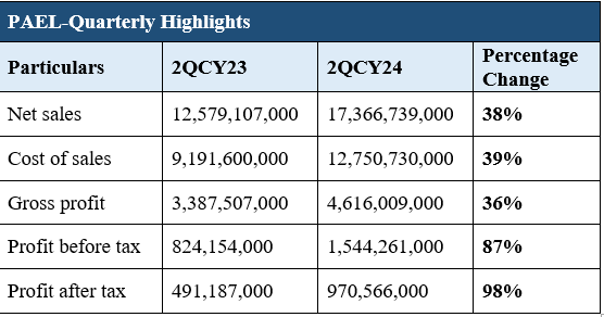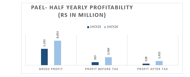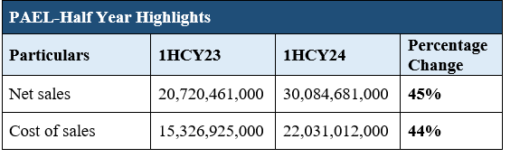 The profit growth was primarily attributed to significant sales increases, higher other income, relaxed import restrictions, and overall market stability. The company reported a revenue increase to Rs30 billion, representing a 45% rise compared to the corresponding period of the earlier calendar year. Additionally, the cost of sales grew by 44% year-on-year (YoY); however, this increase was proportionally less than the revenue growth. Consequently, the gross profit improved by 49% YoY to Rs8 billion in the first half of CY2024.