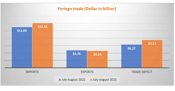 Imports shrunk by 9.25% in the first two months of the current fiscal year (July-August), reaching $11.028 billion, down from $12.152 billion in the same period of the previous year.