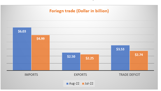 The country’s imports witnessed a decrease of 8.26% to $6.034 billion in August 2022 from $6.577 billion in the same month of last year.