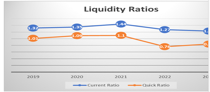 The current ratio remained above 1.2 over the years, indicating a positive liquidity position. This means the company can easily cover its current liabilities using the current assets. The quick ratio was quite stable over the period, ranging from 0.76 to 1.1, but reduced overall from 1.01 in 2019 to 0.84 in 2023.