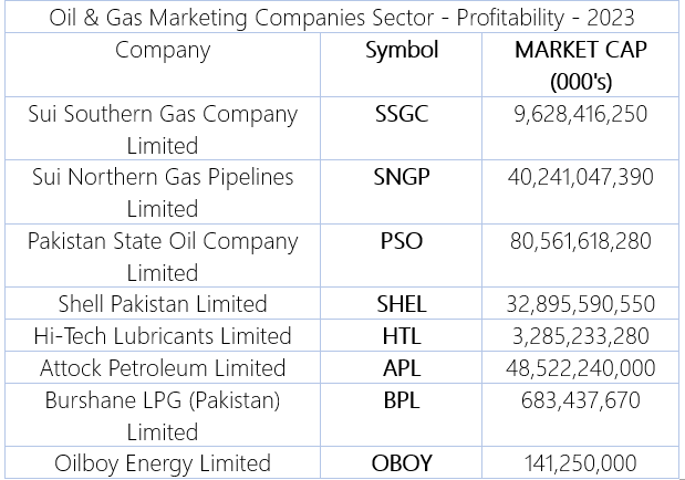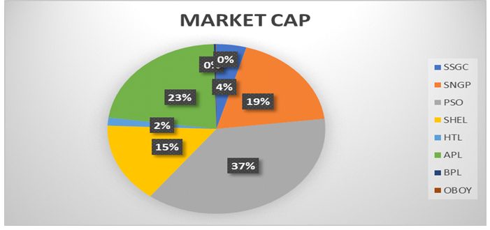 We have taken the market capitalization of the companies to analyze the oil & gas marketing companies sector. The market capitalization measures the worth of a company by the total market value of all outstanding shares. In the oil & gas marketing companies sector, the Pakistan State Oil Company Limited is leading the sector with 37% of the total outstanding shares followed by 23% of the market capitalization by the Attock Petroleum Limited and 19% by the Sui Northern Gas Pipelines Limited.