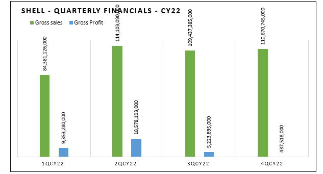 Quarterly review of the year 2022 reveals that the company secured the highest sales and gross profit in the second quarter (April-June). Shell posted sales of Rs84 billion in the first quarter, which increased to Rs114 billion in the second quarter. The company posted sales of Rs109 billion and Rs110 billion in third and fourth quarters, respectively.
