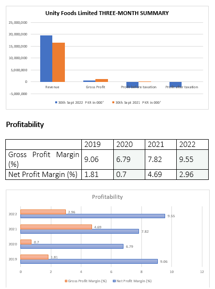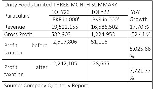 Unity Foods Limited’s revenue increased 17% to Rs19.5 billion in the first quarter of the fiscal year 2022-23 from Rs16.5 billion in the corresponding period of the previous year.However, the company’s gross profit plunged 52% to Rs582 million in 1QFY23 from Rs1.22 billion in 1QFY22. The company sustained a massive loss-before-taxation of Rs2.51 billion in 1QFY23 compared to a pre-tax profit of Rs51.1 million in 1QFY22. Similarly, the company sustained a massive post-tax loss of Rs2.24 billion in 1QFY23 compared to Rs28.6 million loss in 1QFY22, showing a staggering 7,721% decline year-over-year, reports WealthPK.