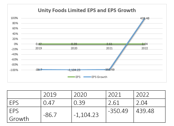 The company saw negative earnings per share growth from 2019 to 2021. However, the EPS saw a remarkable growth in 2022 as it jumped to 439.48% from -350.49% in 2021.