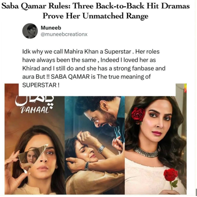 “I don’t know why we call Mahira Khan a superstar. Her roles have always been the same. Saba Qamar is the true definition of a superstar.”