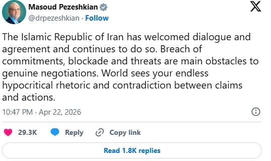 Iranian leaders have said they are still willing to talk, but only if the conditions are different. President Masoud Pezeshkian said that Iran still wants to talk, but he also said that blockades, broken promises, and military threats are still the main things that keep real negotiations from happening. Mohammad Bagher Ghalibaf, the Speaker of the Iranian Parliament, also said that reopening the strait would be impossible as long as foreign pressure continues.