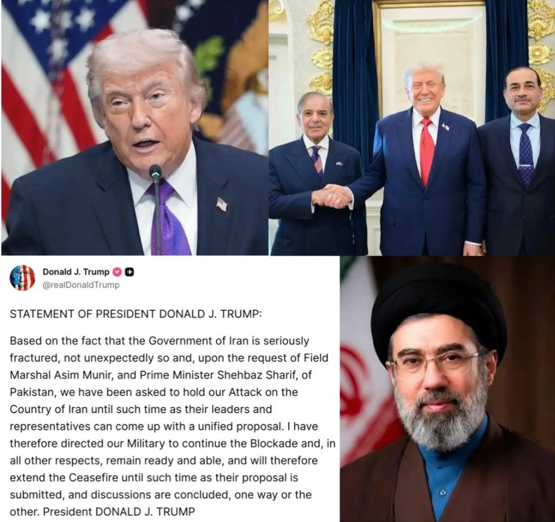 American President Donald Trump issued a public statement clearly saying that on the request of Pakistan’s Field Marshal Asim Munir and Prime Minister Shahbaz Sharif, it has been decided to extend the ceasefire on Iran until their proposal is submitted and discussions are concluded.