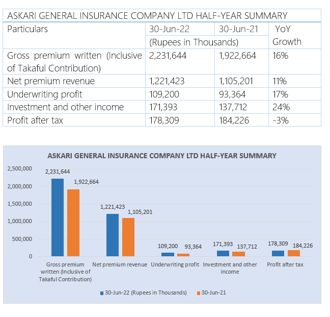 Askari General Insurance Company Ltd’s gross premium written (inclusive of Takaful contribution) grew 16% to Rs2.2 billion in the first six months of CY2022 ending June 30 compared with Rs1.92 billion in the corresponding period of 2021, reports WealthPK.