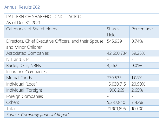 As of Dec 31, 2021, directors, chief executive officers, and their spouses and minor children owned 0.74% of the company’s shares, associated companies 59.25%, banks, development financial institutions, and non-banking financial institutions 0.01%, mutual funds 1.08%, individual (local) held 20.90%, individual (foreign) 2.65% and others 7.42%.