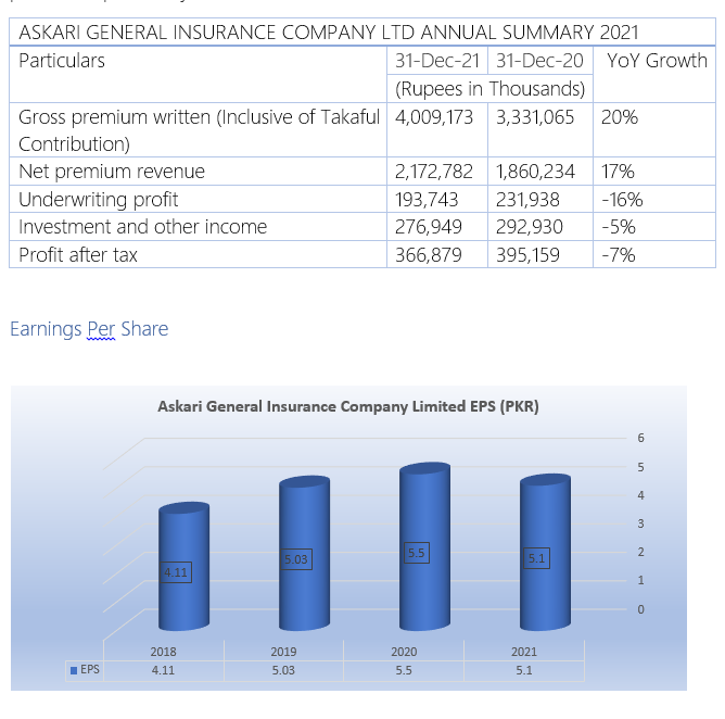 During the CY2021, the company registered gross premium written of PKR4 billion with an increase of 20% as against PKR3.3 billion in CY2020. The net premium revenue for the year 2021 was PKR2.2 billion, 17% up from PKR1.86 billion in the previous year. The profit after taxation for the CY2021 was PKR366 million with a decrease of 7% compared to PKR395 million in the corresponding period the previous year.