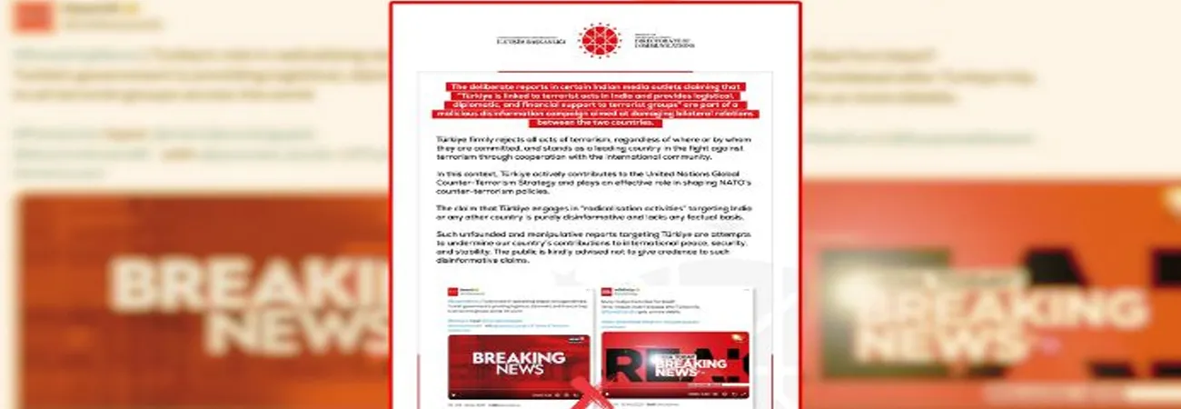 بیان میں مزید کہا گیا کہ ترکیے ہر قسم کی دہشت گردی کی سختی سے مذمت کرتا ہے اور عالمی برادری کے ساتھ تعاون کے ذریعے دہشت گردی کے خلاف جنگ میں ایک نمایاں ملک کے طور پر کردار ادا کر رہا ہے۔بیان میں مزید کہا گیا کہ بھارت یا کسی اور ملک کے خلاف مبینہ طور پر انتہا پسندی پھیلانے کی سرگرمیوں میں ترکیے کے ملوث ہونے کے الزامات سراسر بے بنیاد اور حقائق کے منافی ہیں۔ترک سفارتخانے نے کہا کہ اس نوعیت کی جھوٹی اور گمراہ کن رپورٹس عالمی امن، سلامتی اور استحکام میں ترکیے کے کردار کو کمزور کرنے کی کوشش ہیں۔سفارت خانے نے عوام سے اپیل کی کہ وہ ایسے بے بنیاد اور گمراہ کن دعوں پر یقین نہ کریں۔