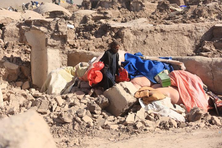 افغانستان، مغربی صوبے ہرات کے ضلع زندہ جان میں زلزلہ سے متاثرہ ایک گاؤں میں ایک شخص گھروں کے ملبے سے گزررہا ہے۔ (شِںہوا)