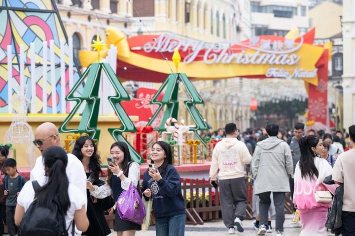 جنوبی چین کے مکاؤ میں سیاح سیناڈو اسکوائر کا دورہ کررہے ہیں۔ (شِنہوا)
