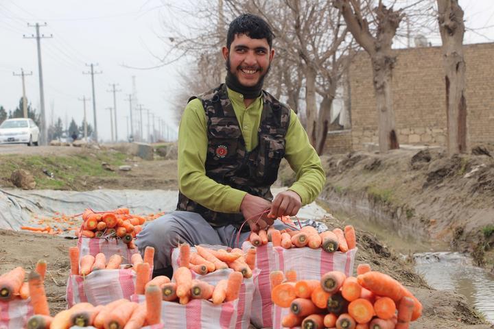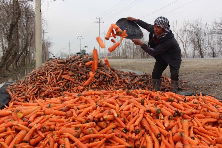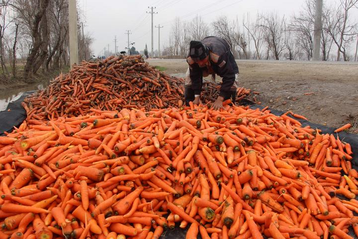 افغانستان ، صوبہ قندوز میں ایک کسان گاجروں کو ایک ڈھیر پر رکھ رہاہے۔ (شِنہوا)