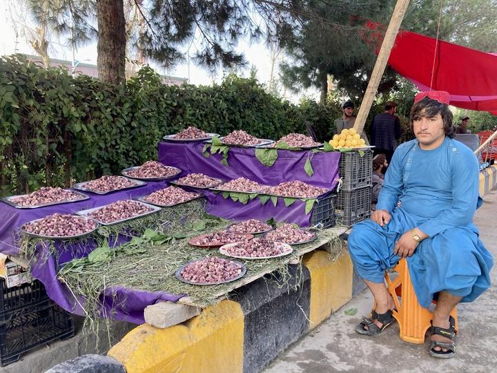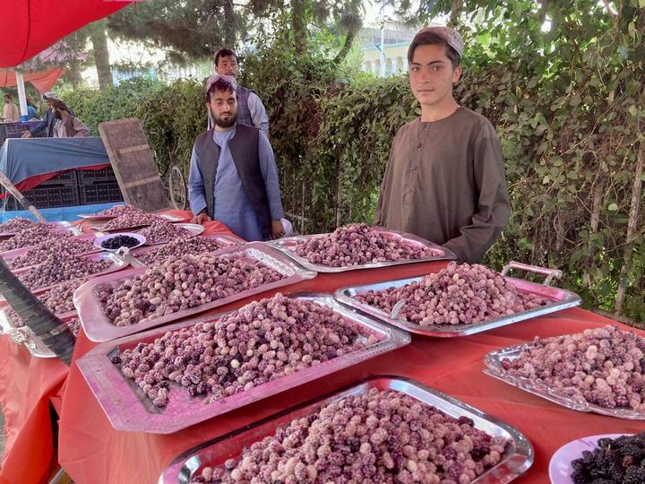 افغانستان، صوبہ قندھار میں سڑک کنارے افغان شہری سفید شہتوت فروخت کررہے ہیں۔(شِنہوا)