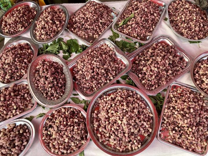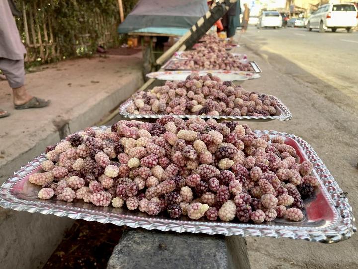 افغانستان، صوبہ قندھار میں سڑک کنارے اسٹیل پلیٹس میں رکھے سفید شہتوت کو دیکھا جاسکتا ہے۔(شِنہوا)