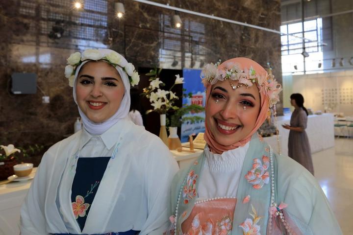 اردن ، عمان کی ایک آرٹ گیلری میں سیلون میں اردنی طالبات نے ہانفو زیب تن کرر کھا ہے۔ (شِنہوا)
