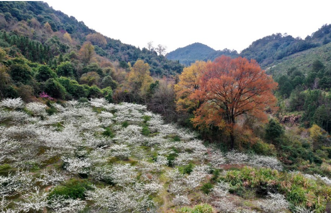 چین، جنوب مشرقی صوبہ فوجیان کی کاؤنٹی یونگ تائی کے گاؤں چھیان ہو میں آلو بخارے کے کھلتے پھولوں میں ایک دیہاتی کھیتی باڑی کررہا ہے۔(شِںہوا)