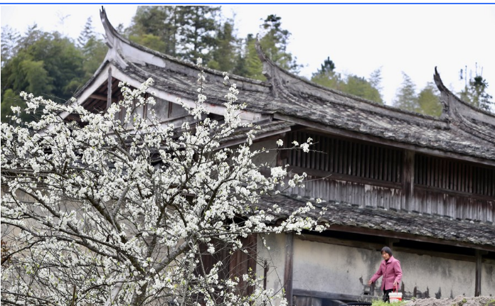 چین، جنوب مشرقی صوبہ فوجیان کی کاؤنٹی یونگ تائی کے گاؤں گائی یانگ میں قدیم عمارت کے قریب آلوبخارے کے کھلتے پھول دیکھے جاسکتے ہیں۔(شِںہوا)