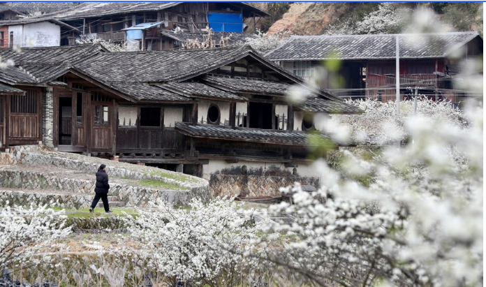 چین، جنوب مشرقی صوبہ فوجیان کی کاؤنٹی یونگ تائی کے گاؤں گائی یانگ میں آلوبخارے کے کھلتے پھولوں کے درمیان قدیم عمارتیں دیکھ جاسکتی ہیں۔(شِںہوا)