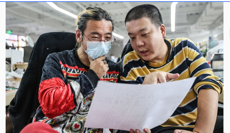 چین، جنوبی صوبہ ہائی نان کے شہر ہائیکو کے قصبے لونگ چھیاؤ کے دیہات چھانگ شوئے کے ایک اینی میشن انکیوبیشن مرکز میں کارٹونسٹ لیو کی (بائیں) اپنے ایک ساتھی سے بات کررہا ہے۔ (شِنہوا)