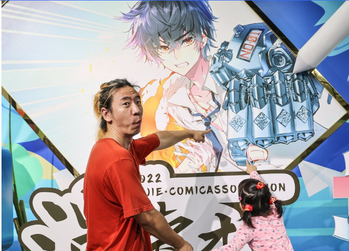 چین، جنوبی صوبہ ہائی نان کے شہر ہائیکو کے قصبے لونگ چھیاؤ کے دیہات چھانگ شوئے کے ایک اینی میشن انکیوبیشن مرکز میں کارٹونسٹ لیو کی کا اپنی بیٹی کے ساتھ اپنے تیار کردہ فن پارے کے سامنے تصویر کے لئے ایک انداز۔ (شِنہوا)