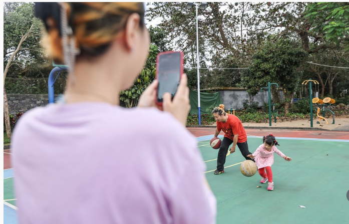 چین، جنوبی صوبہ ہائی نان کے شہر ہائیکو کے قصبے لونگ چھیاؤ کے دیہات چھانگ شوئے کے ایک اسکول کے ایک باسکٹ بال کورٹ میں کارٹونسٹ لیو (درمیان) اپنے اہل خانہ کے ساتھ کھیل رہا ہے۔ (شِنہوا)