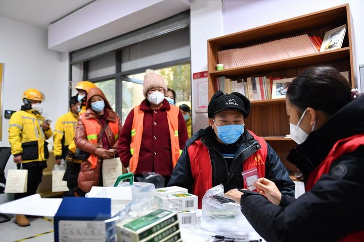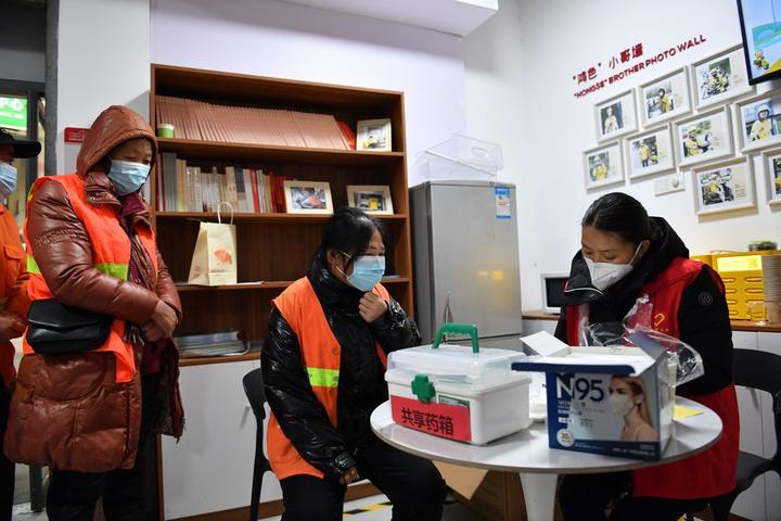 چین، وسطی صوبہ ہونان کے شہر چھانگ شا کے ایک کمیونٹی خدمت مرکز میں صفائی کا عملہ مفت ادویات وصول کرر ہا ہے۔ (شِنہوا)
