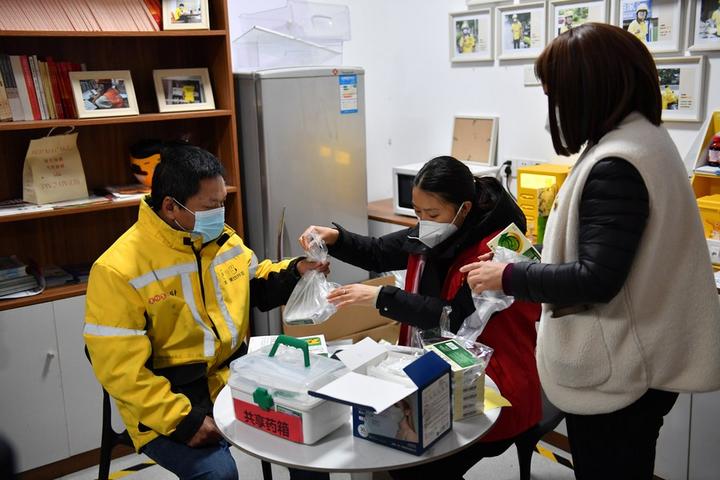 چین، وسطی صوبہ ہونان کے شہر چھانگ شا کے ایک کمیونٹی خدمت مرکز میں صفائی کا عملہ اور ڈیلیوری فراہم کرنے والے مفت ادویات وصول کررہے ہیں۔ (شِنہوا)
