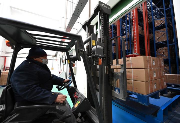 چین ، شمالی تیان جن کی ایک دوا ساز کمپنی میں ایک مزدور ادویات منتقل کررہا ہے۔ (شِنہوا)