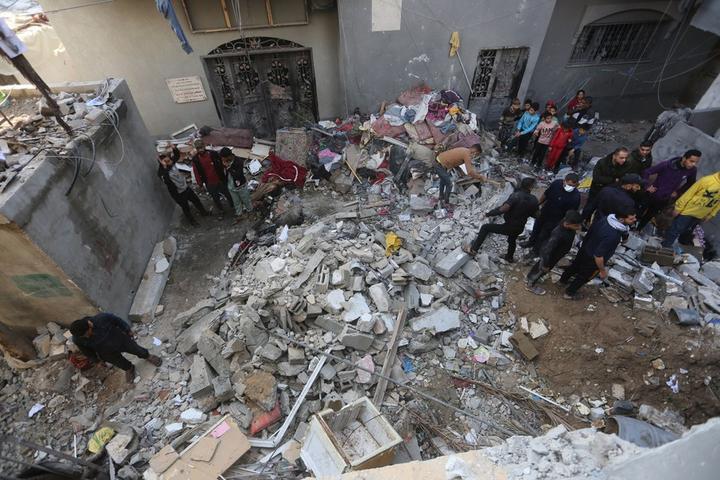 غزہ کی پٹی کے جنوبی شہر رفح میں اسرائیلی حملے میں تباہ ہونے والی عمارت کے ملبے کے درمیان لوگ دکھائی دے رہے ہیں۔(شِنہوا)