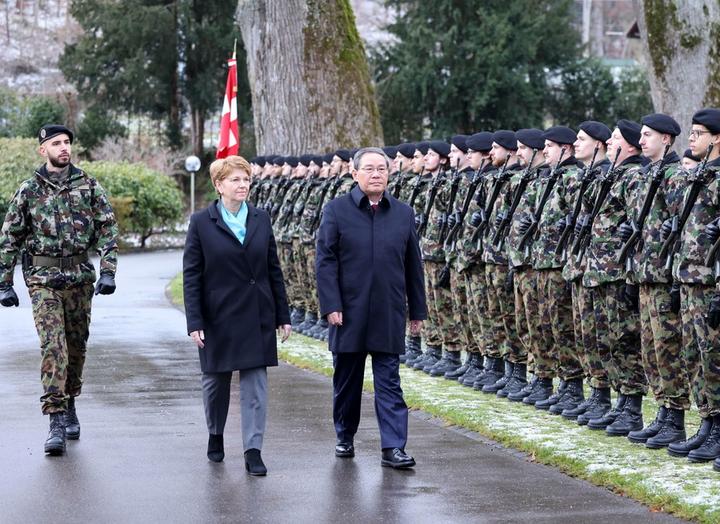 سوئٹرز لینڈ، برن کے لوہان اسٹیٹ میں چینی وزیراعظم لی چھیانگ سوئس کنفیڈریشن کی صدر ویولا ایم ہرڈ کے ساتھ گارڈ آف آنر کا معائنہ کررہے ہیں۔ (شِنہوا)