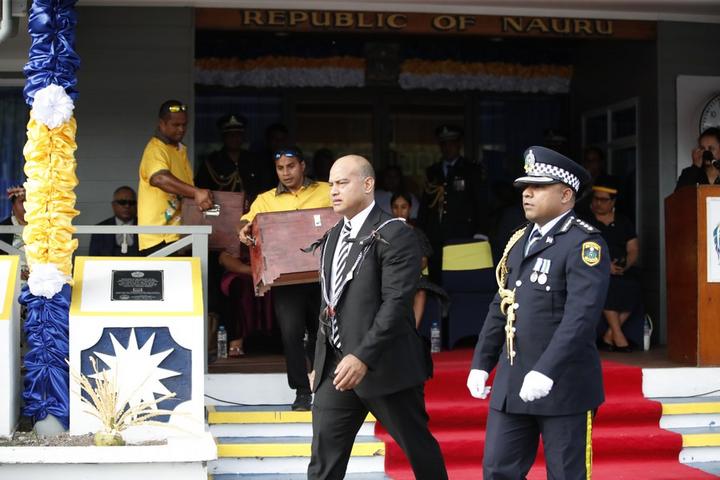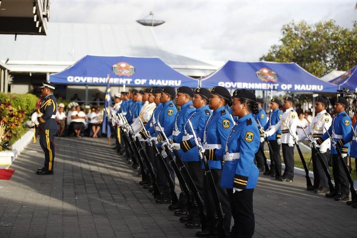 ناورو میں آزادی کی 56 ویں سالگرہ کی تقریب میں پولیس کا دستہ گارڈ آف آنر پیش کر رہا ہے۔ (شِنہوا)