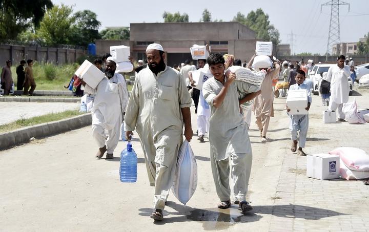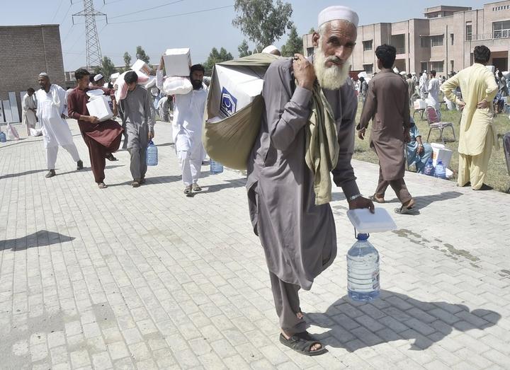 پشاور کے مضافات میں سیلاب زدگان امدادی سامان وصول کرنے کے بعد واپس جارہے ہیں۔ (شِنہوا)